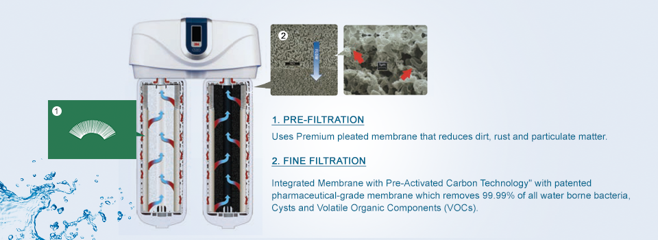 The system provides 2 stages of Filtration – Pre Filtration (Uses premium pleated membrane that reduces dirt, rust and particulate matter) and Fine Filtration (Integrated Membrane with Pre Activated Carbon Technology integrates patented pahrmaceutical grade membrane with pre-activated 3M Carbon block to remove 99.99% of all water borne bacteria, cysts and volatie organic components.